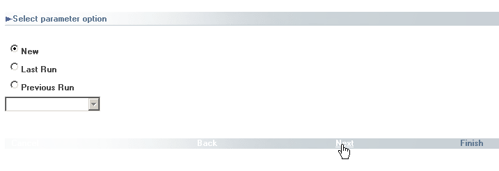 Using the option buttons provided, click New to enable the selection of new parameters. (Note: Clicking Last Run sets the parameters to those chosen from the previous run. Clicking Previous Run enables the drop-down list from which you can select a run to use.)