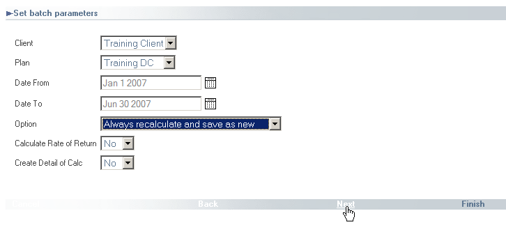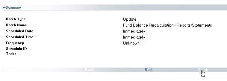 Click Next to advance to the Summary screen. The Fund Balance Recalculation batch calculates, for each identified member, an opening and closing balance for the specified Client, Plan, and Period specified in the parameters.