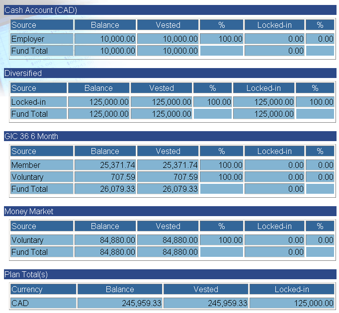 For each fund, the system maintains parameters such as Fund Code, Short Name, Long Name, Currency, Fund Class, Foreign Content, Trade Cut-off Time, Business Days, Holidays, Holiday Rule, Fee (%), Minimum Fee ($), Fee Deduction, Fee Type, and Status in addition to fund-type specific parameters such as, Valuation Start Date, Valuation Frequency, Matured GIC Handling, etc. See Fund Setup.