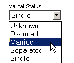 Allows you to modify existing data by overwriting or selecting a different option from a drop-down list. Change the marital status from 'single' to 'married'. Modify a first name: | |||||